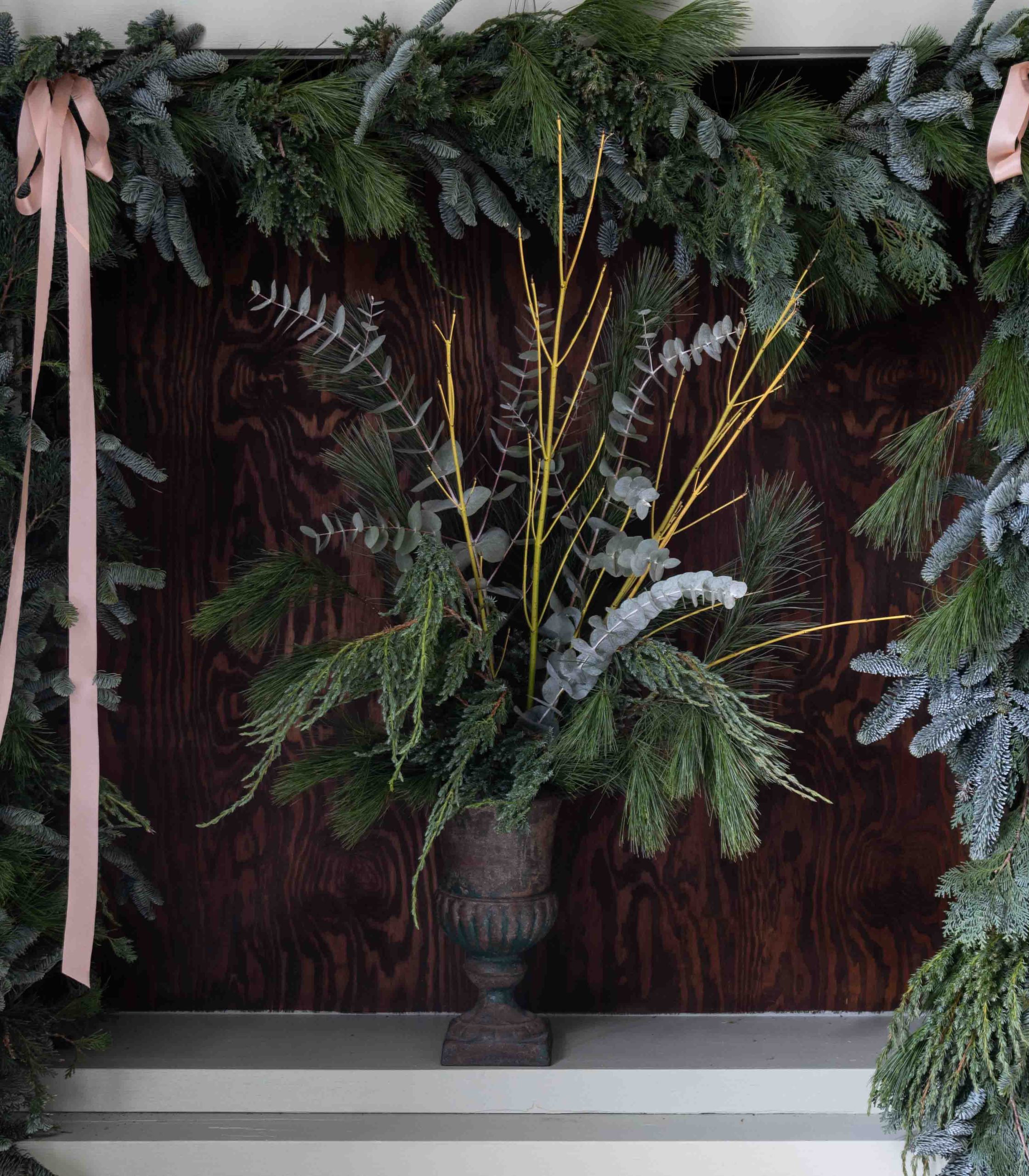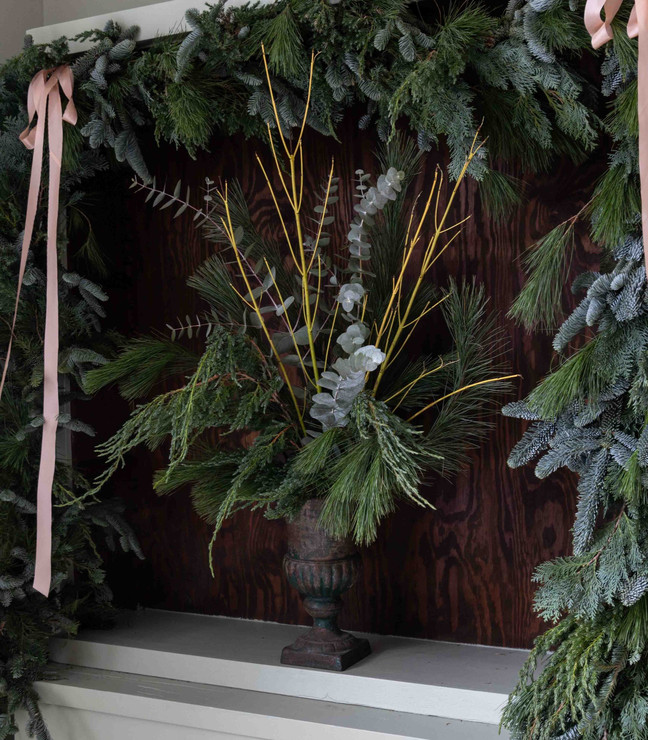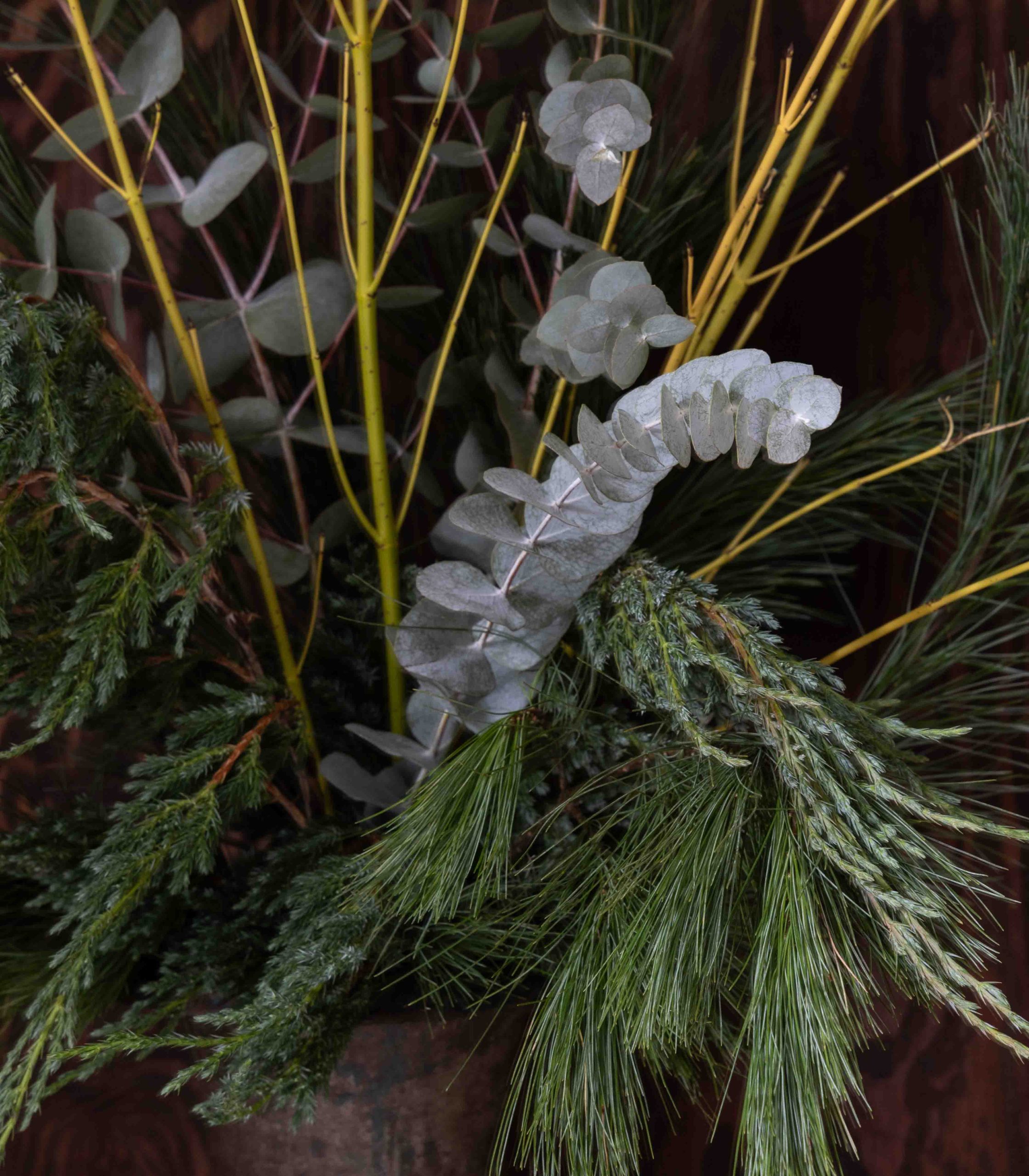 Kompozycja świąteczna wykonana z sosny wejmutki, jodły Nobilis, jałowca, eukaliptusa i gałązek derenia.
