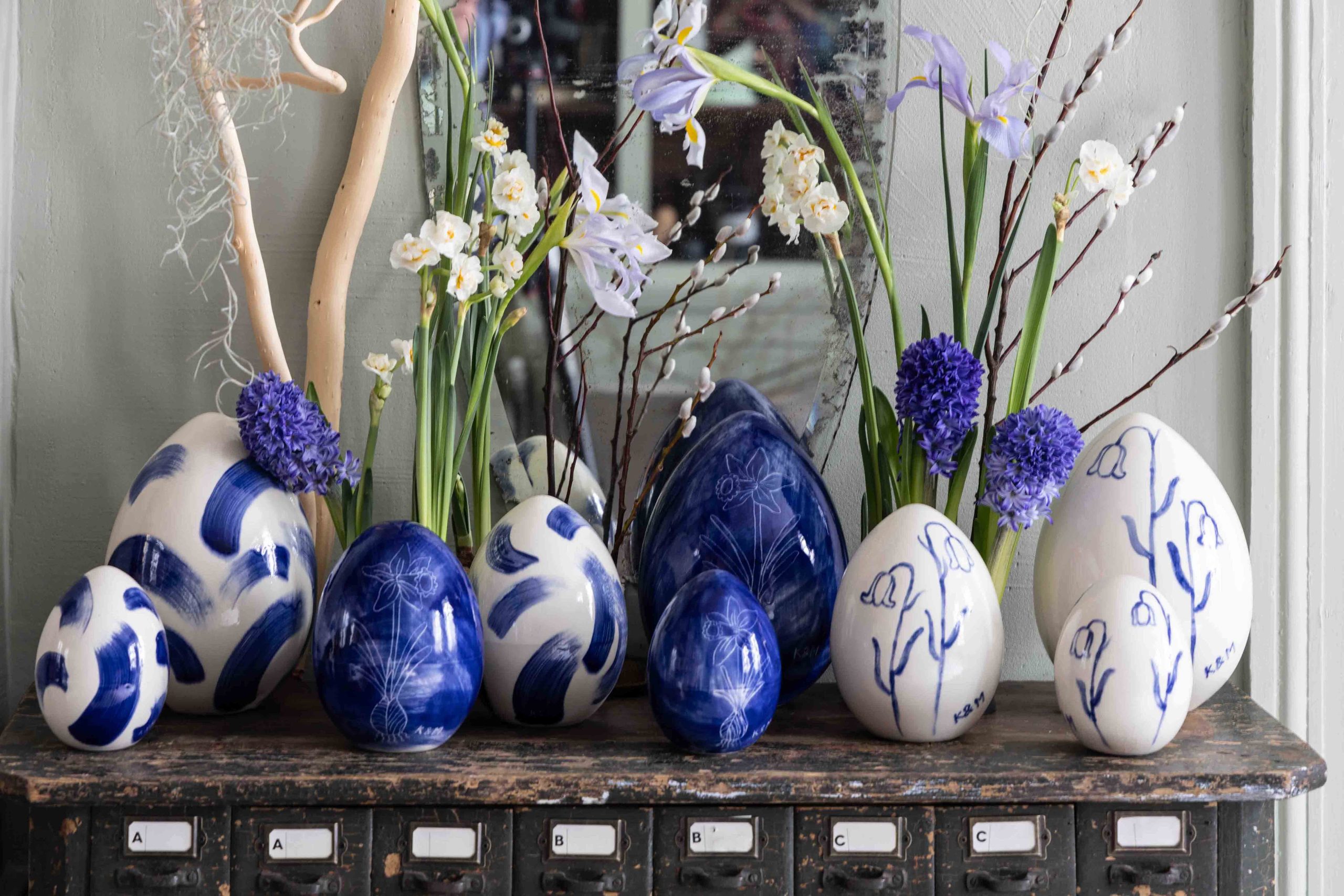 Jaja ceramiczne malowane kobaltem przez Łukasza Marcinkowskiego.