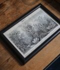 Grafika traw oprawiona w drewnianą ramę ze szkłem antyrefleksyjnym.