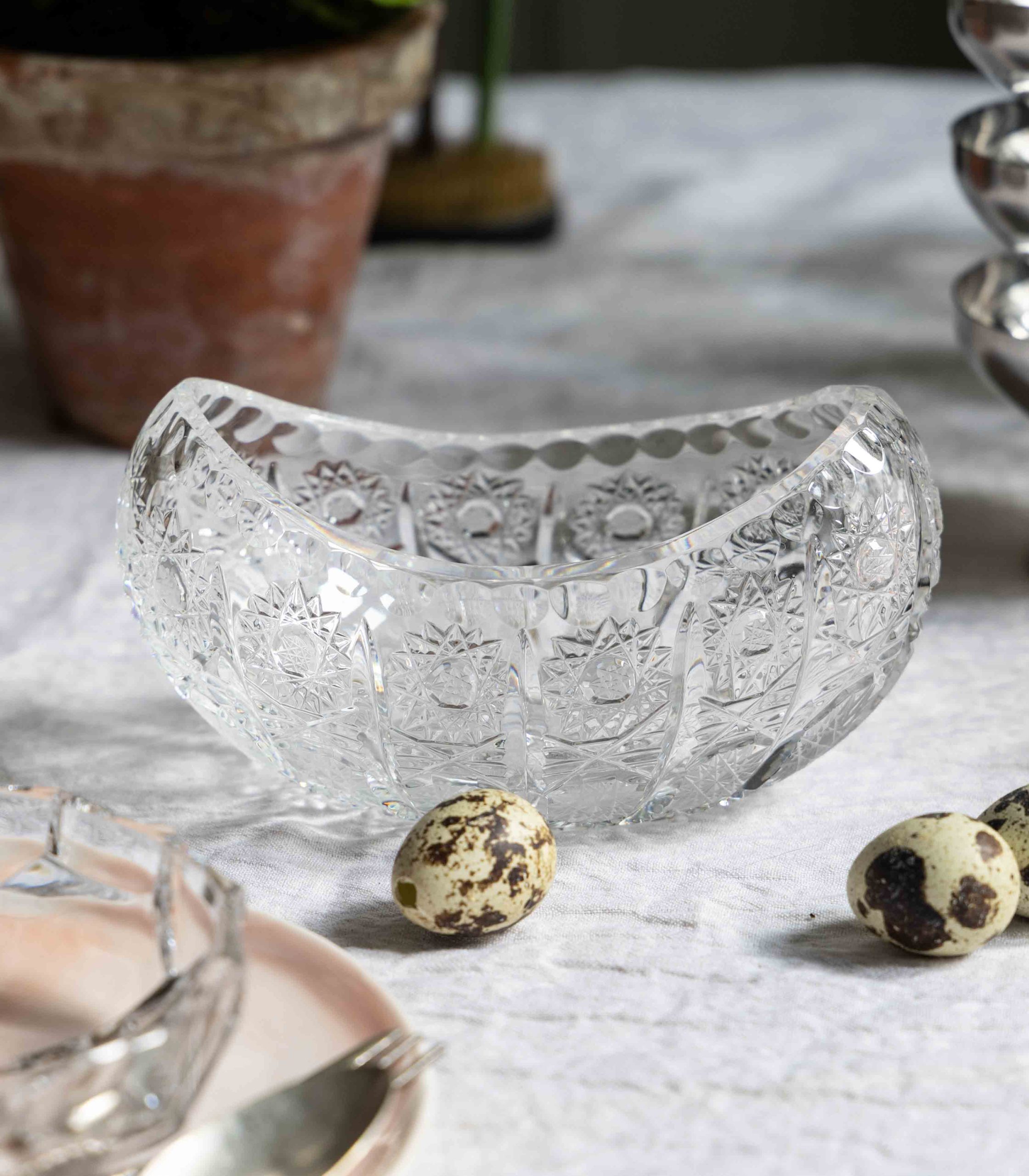 Kryształowa misa, często określana mianem gondoli lub żardiniery ze względu na swój charakterystyczny, wydłużony kształt przypominający łódkę.