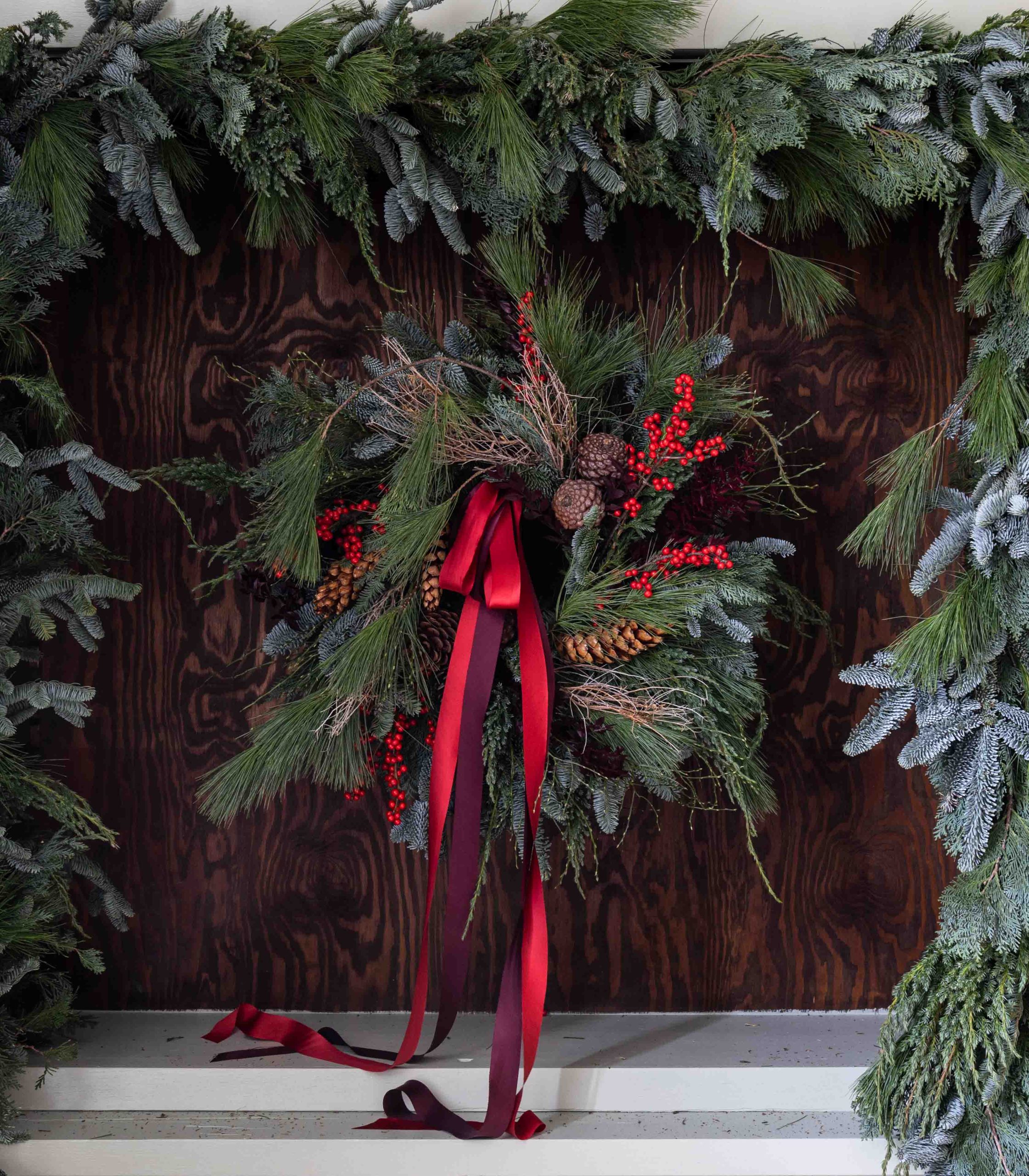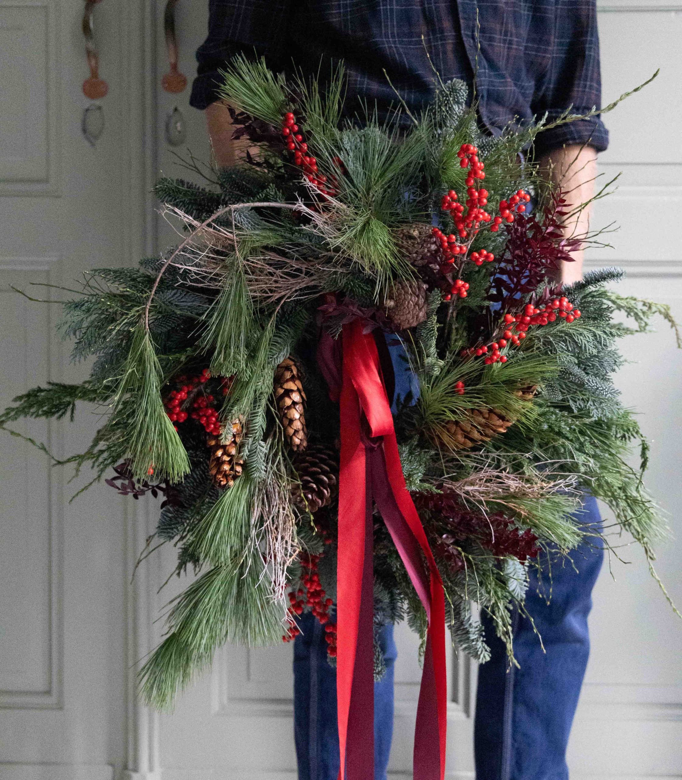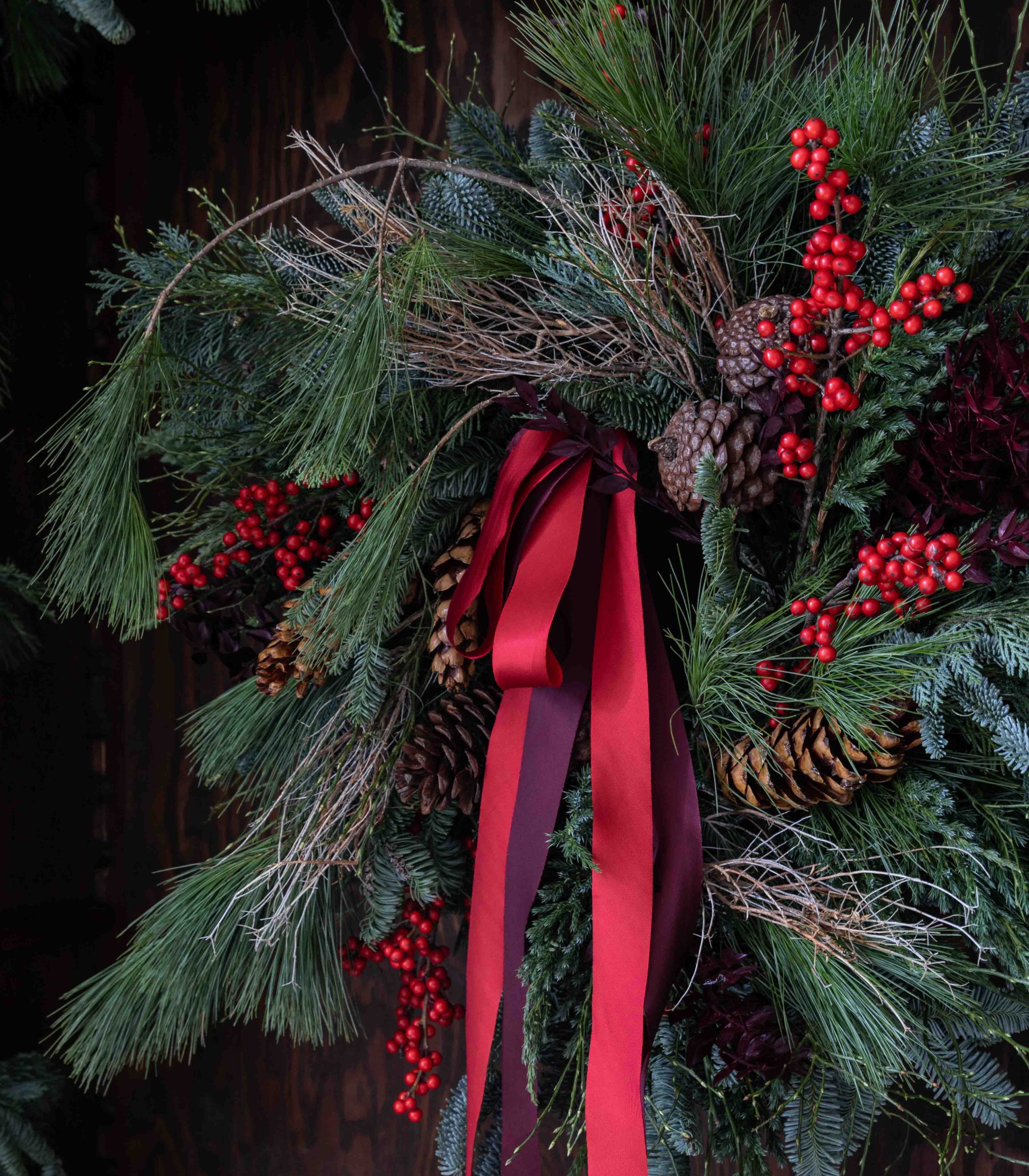 Wianek wykonany z gałązek igielnych, ostrokrzewu, szyszek i barwionego ruszczyku.